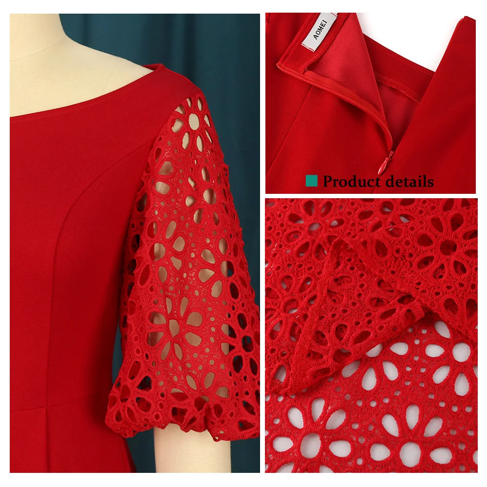 High Quality Plus Size Half Sleeve O-neck A-line Lace Embroidered Women Dress Red Knee-length One Piece Dresses For Party