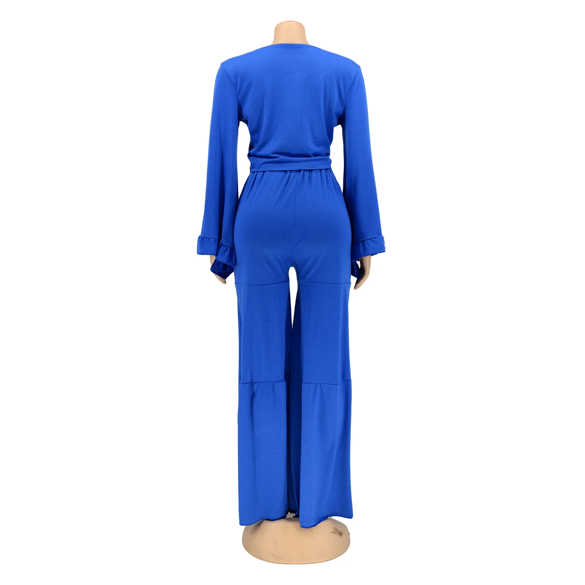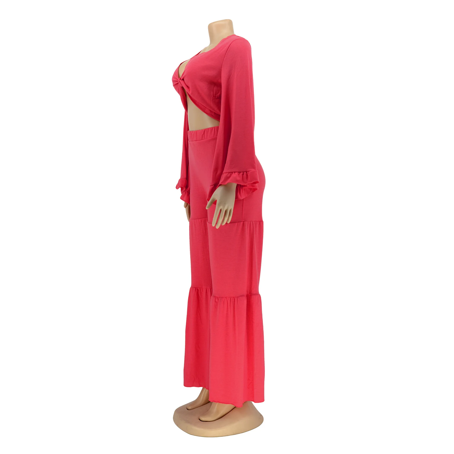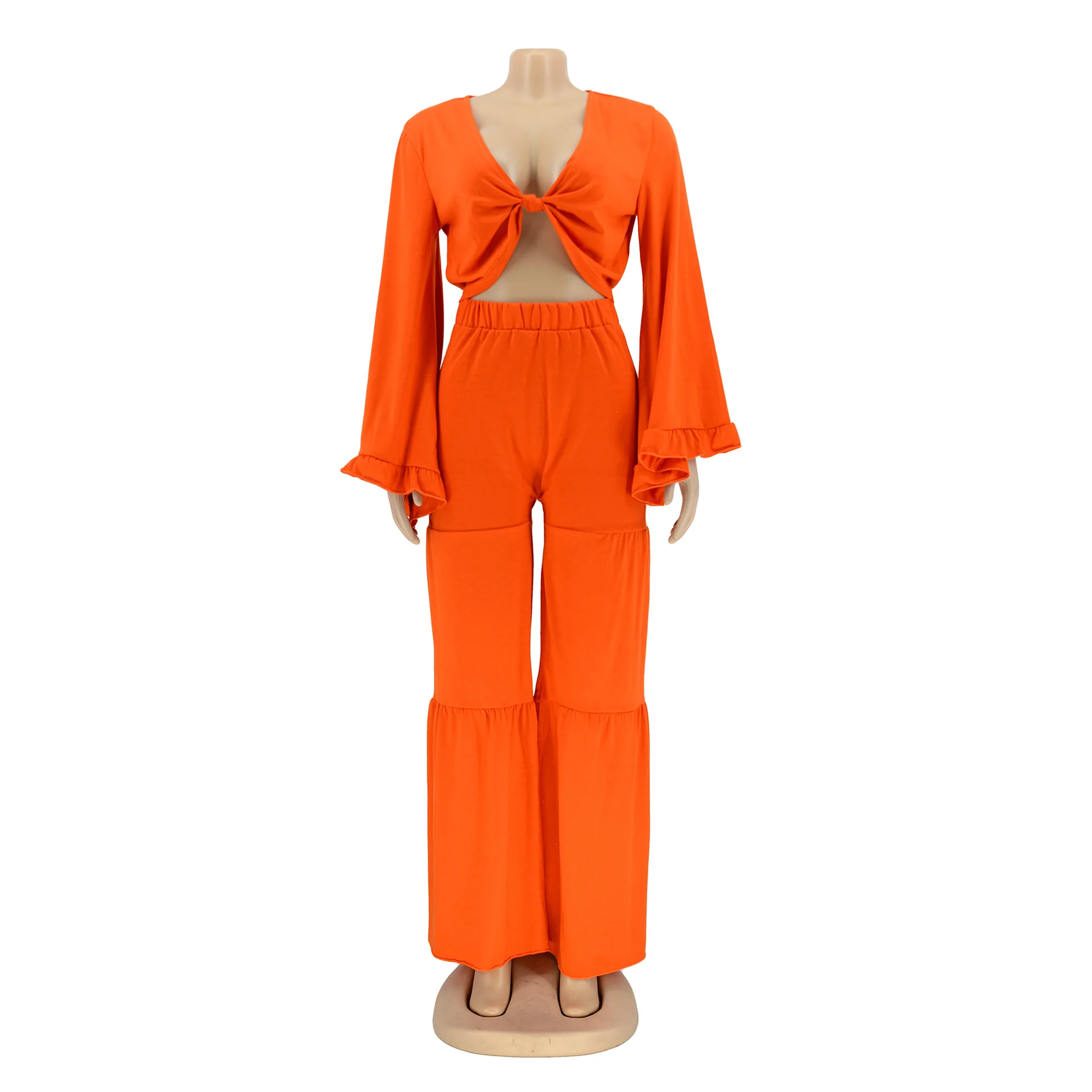 Latest Design Long Sleeve Deep V Neck Wide Leg Sexy Women Clothing Two Piece Set Women Suits Two Piece Crop Tops Pants Set