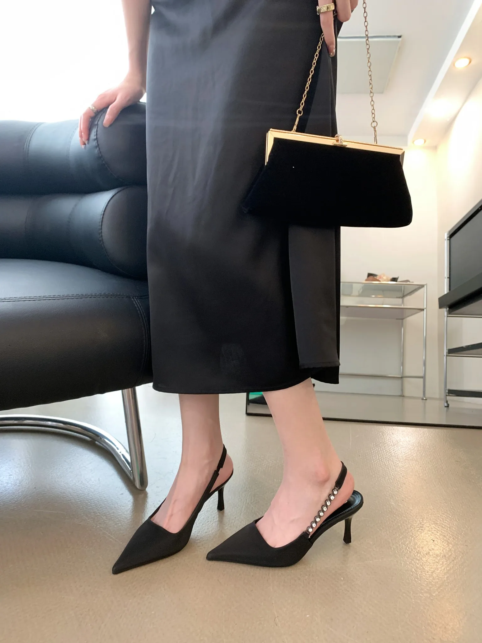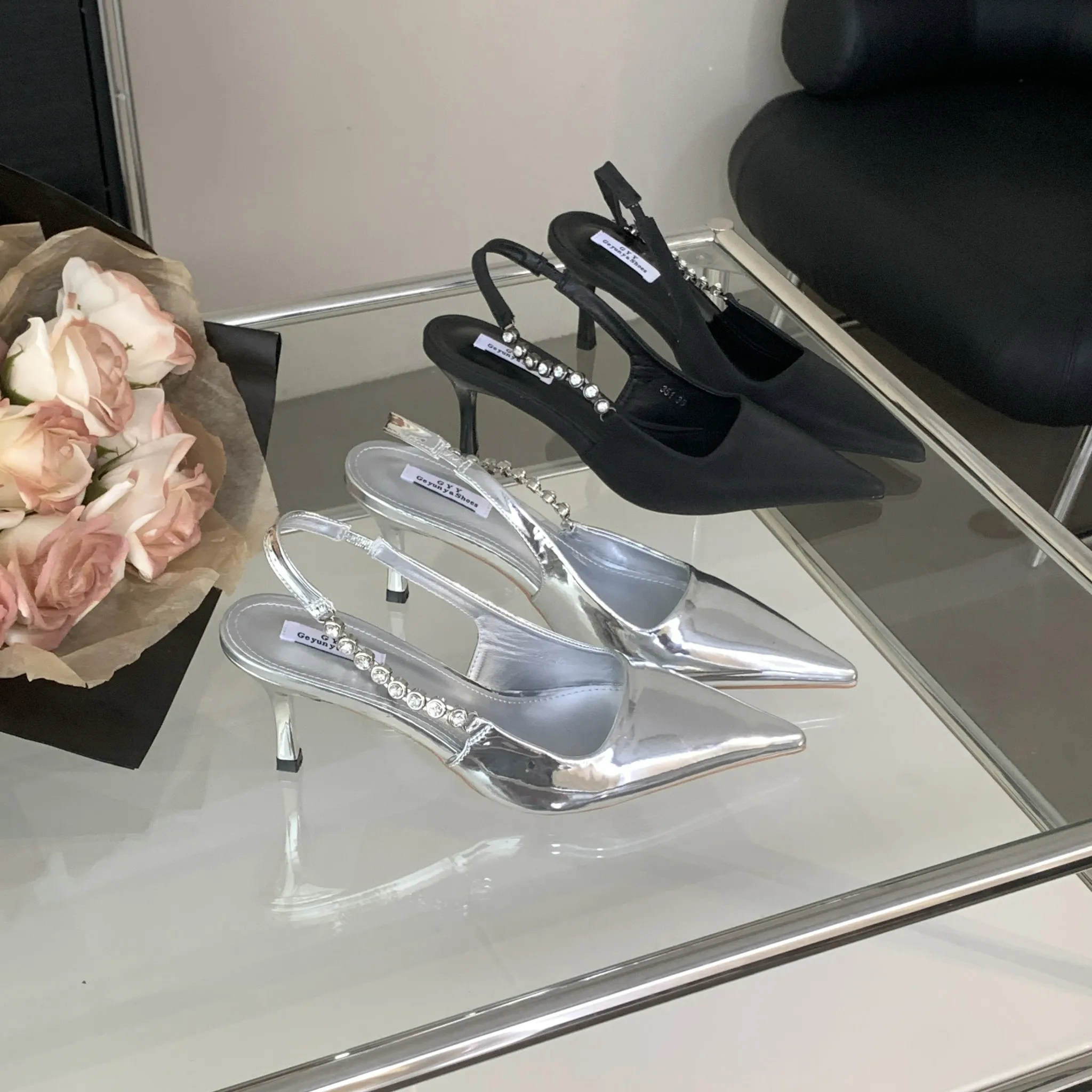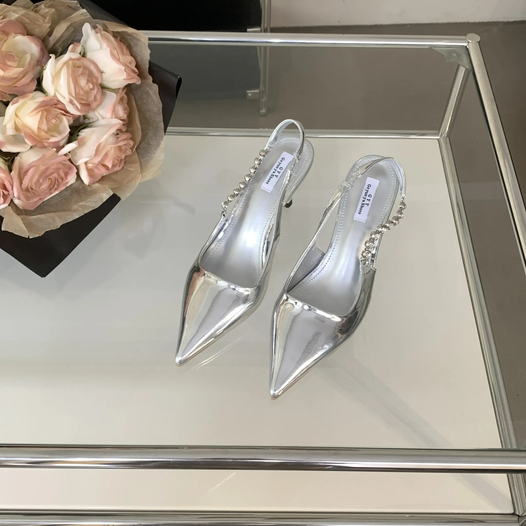 Shiny High Heels Slingback Silver Women Pumps Metallic Crystal Sandals Pointy Toe Stiletto Heeled Shoes Party Dress Shoes Woman