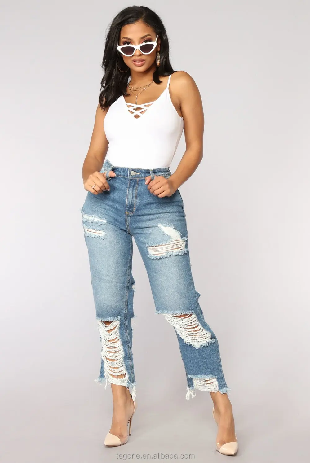 Versatile Wide Leg High Quality Jeans Pants Trousers Drawstring Blue Jean Pants For Women Destroyed Ripped Casual Jean Pants