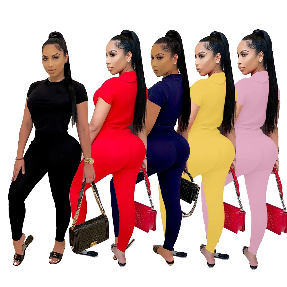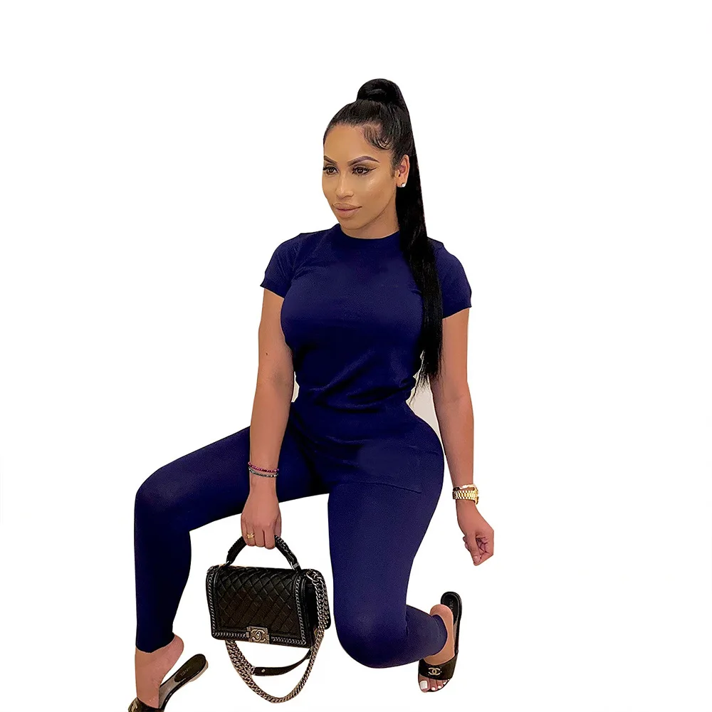 Women Summer Plus Size Casual Solid Two Piece Sets Short Sleeve T Shirt Tops and Elastic Waist Skinny Long Pencil Pants Outfits